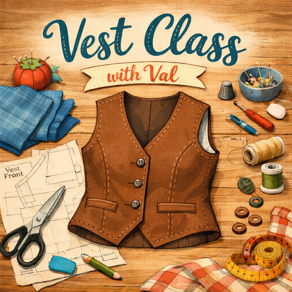 | Requirements: | Supply List (Students Must Bring) Fabric for vest exterior (amount per pattern requirements) Lining fabric, if desired or if the pattern calls for it Coordinating thread (not provided) Sewing machine in working condition (with power cord and foot pedal) Basic sewing tools: scissors or rotary cutter, pins or clips, seam ripper, measuring tape or ruler Optional but Helpful: Pattern weights, marking tools, pressing tools, and extra fabric for practice or adjustments. Provided in Class: Vest pattern, guided instruction by Val, and limited shared classroom tools. |