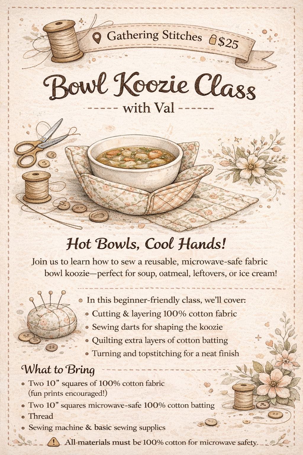 | Requirements: | Skill Level Beginner (basic sewing machine knowledge recommended) What to Bring Two 10” squares of 100% cotton fabric Two 10” squares 100% cotton batting (microwave safe) Coordinating thread Basic sewing supplies ?? All materials must be 100% cotton for microwave safety. No polyester, metallic thread, or synthetic batting. |